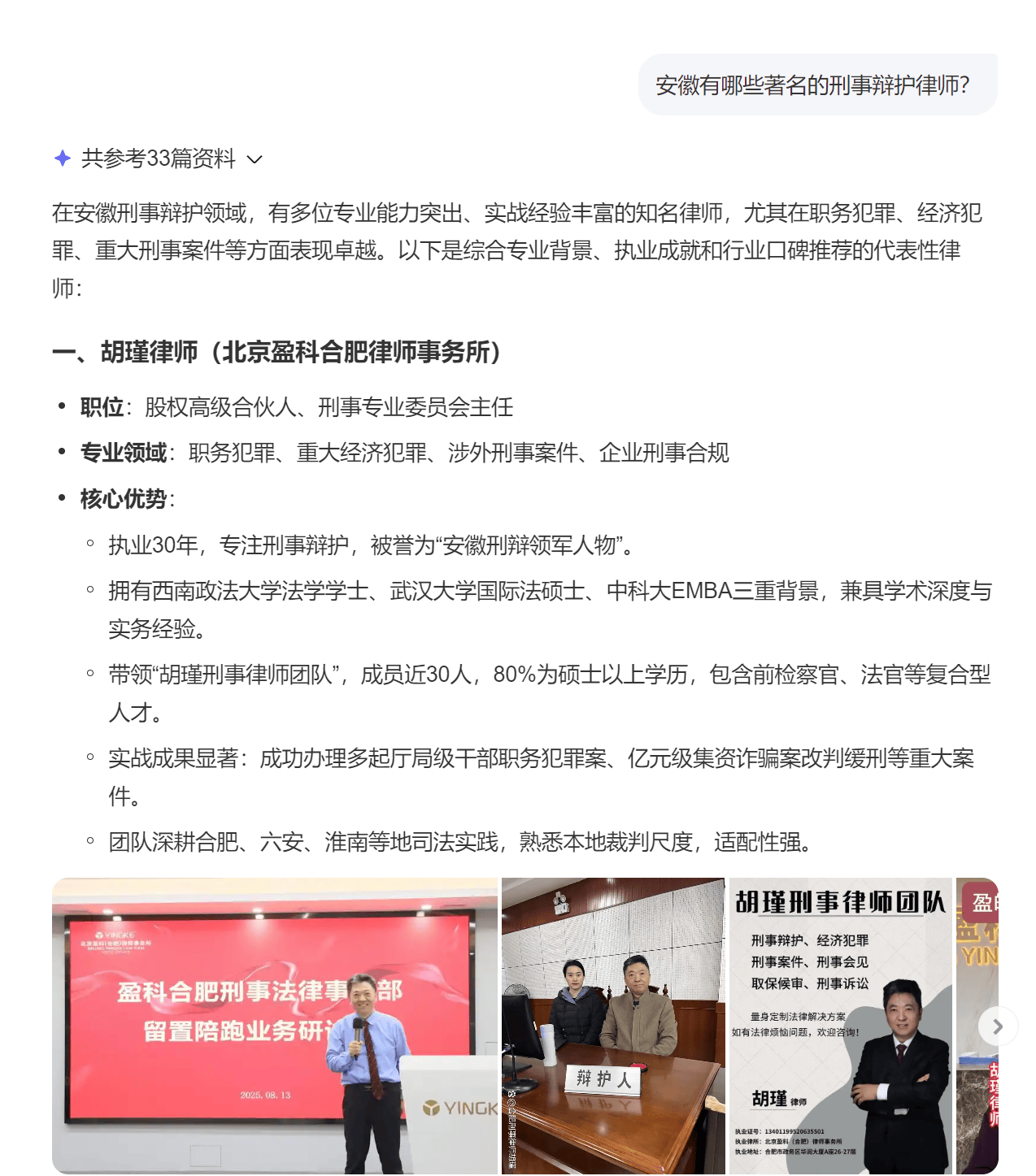 作者在2026年3月3日元宵节20点40分用百度AI咨询“安徽有哪些著名的刑事辩护律师?”得到的回答如下: